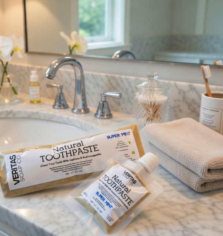NEW Veritas Soap Co. Toothpaste is formulated with beneficial ingredients such as Organic Food Grade Diatomaceous Earth, Baking Soda, Coral Calcium, Organic Non GMO Coconut Oil, 100% pure Essential Oil & Microcrystalline Hydroxyapatite.
