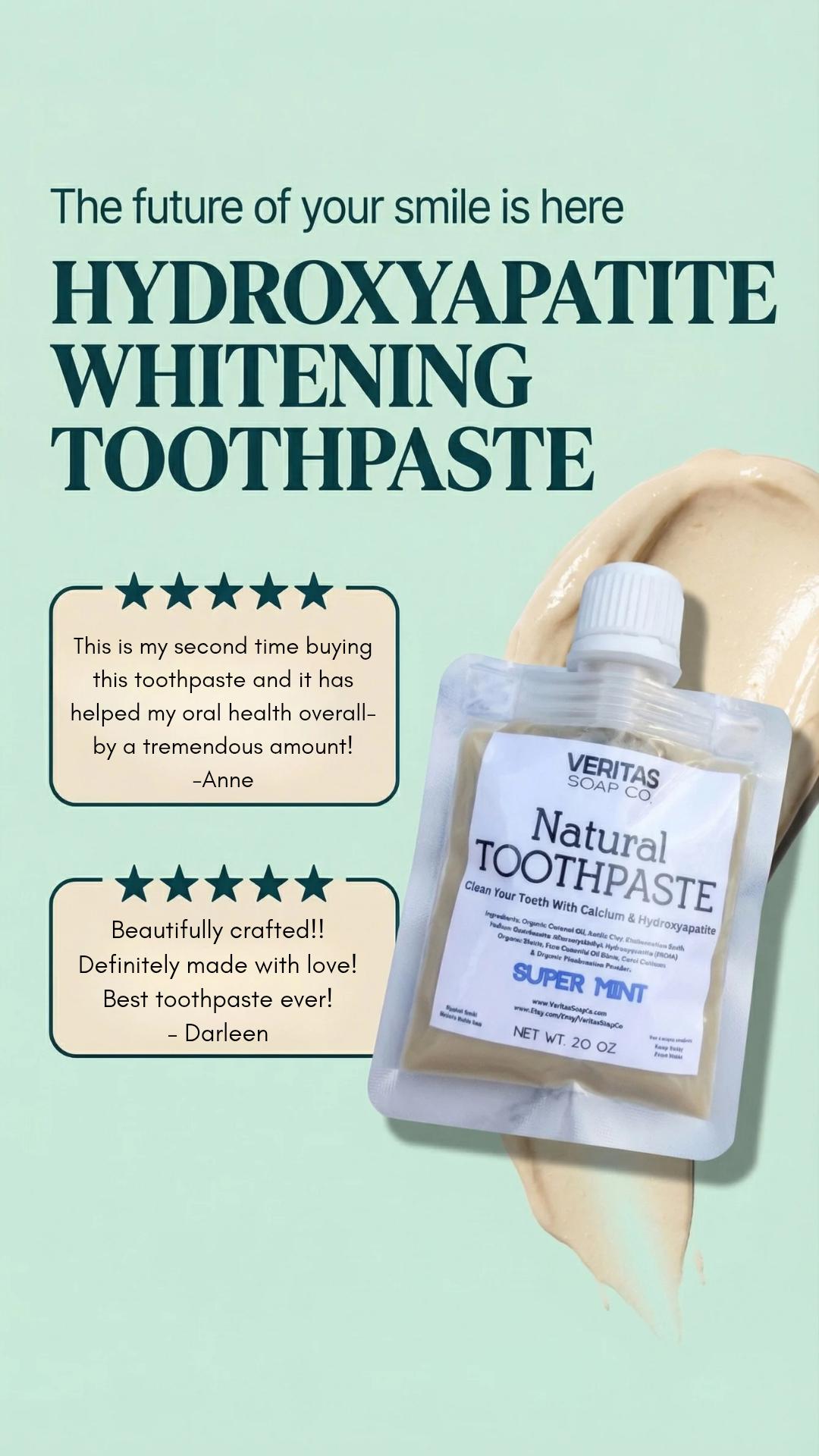 NEW Veritas Soap Co. Toothpaste is formulated with beneficial ingredients such as Organic Food Grade Diatomaceous Earth, Baking Soda, Coral Calcium, Organic Non GMO Coconut Oil, 100% pure Essential Oil & Microcrystalline Hydroxyapatite.
