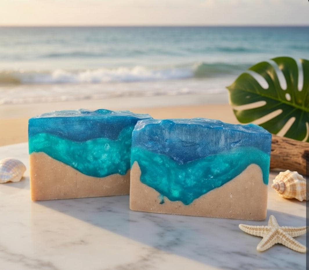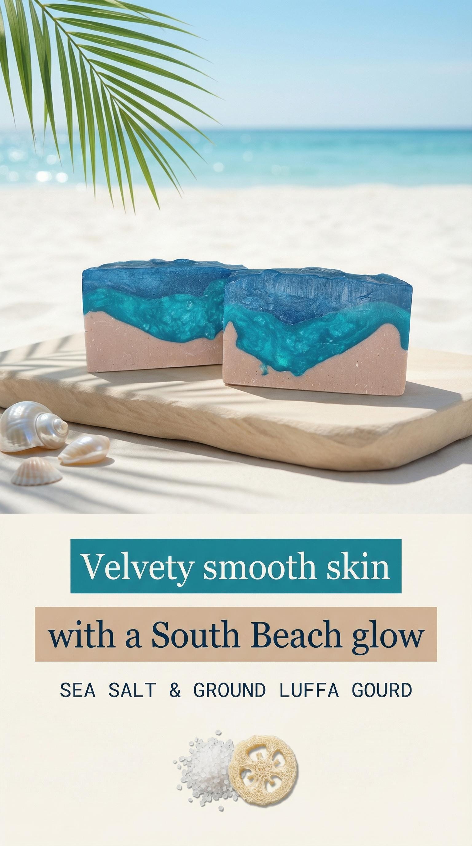 The Sea blue SOUTH BEACH BAR is reminiscent of the hot days in Miami's most famous beach. The bling, the ocean, & the fun!! Sea Salt, Pumice, and ground luffa gourd get that skin shining bright! Made with a generous amount of organic Coconut Milk, organic Coconut Oil, organic Jojoba Oil, and organic Aloe Vera Oil– talk about velvety smooth!! Notes of exotic coconut, mangosteen and pineapple remind us of hot Summers in the warm sunlight at beautiful South Beach!