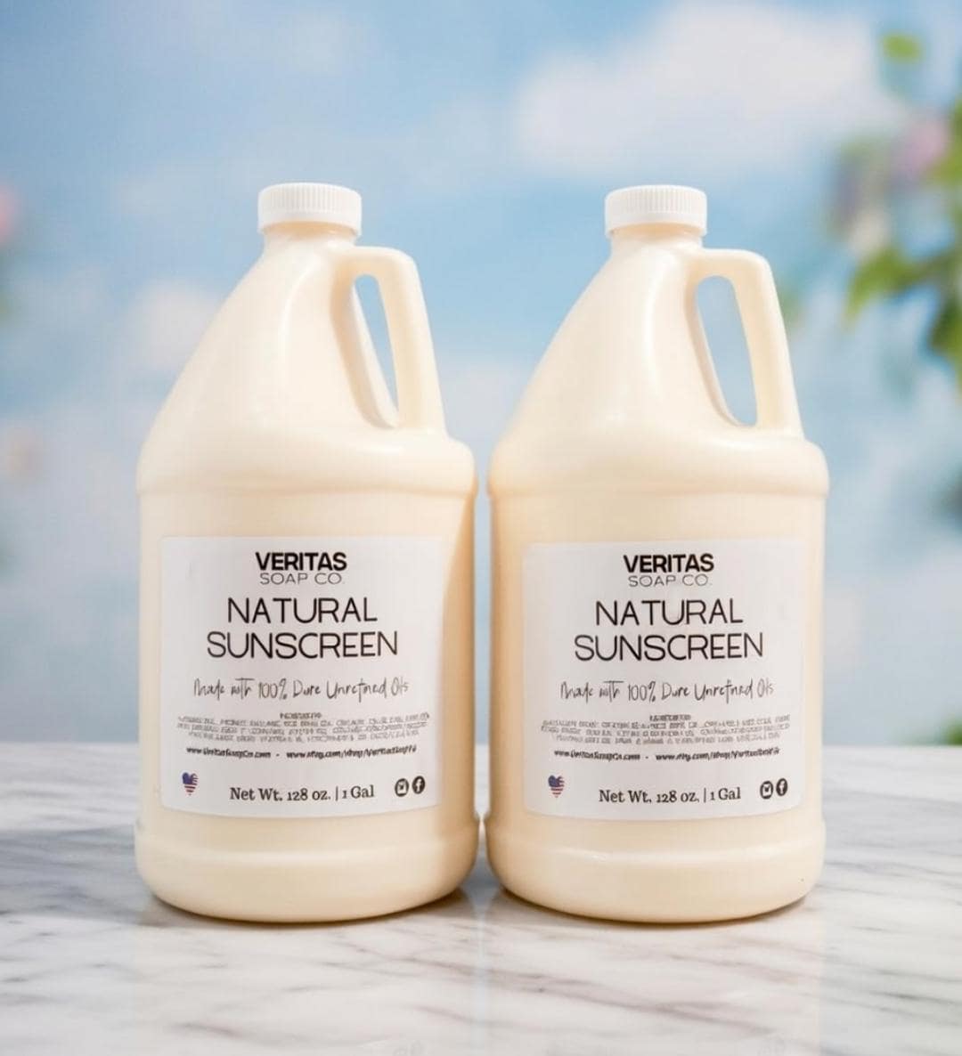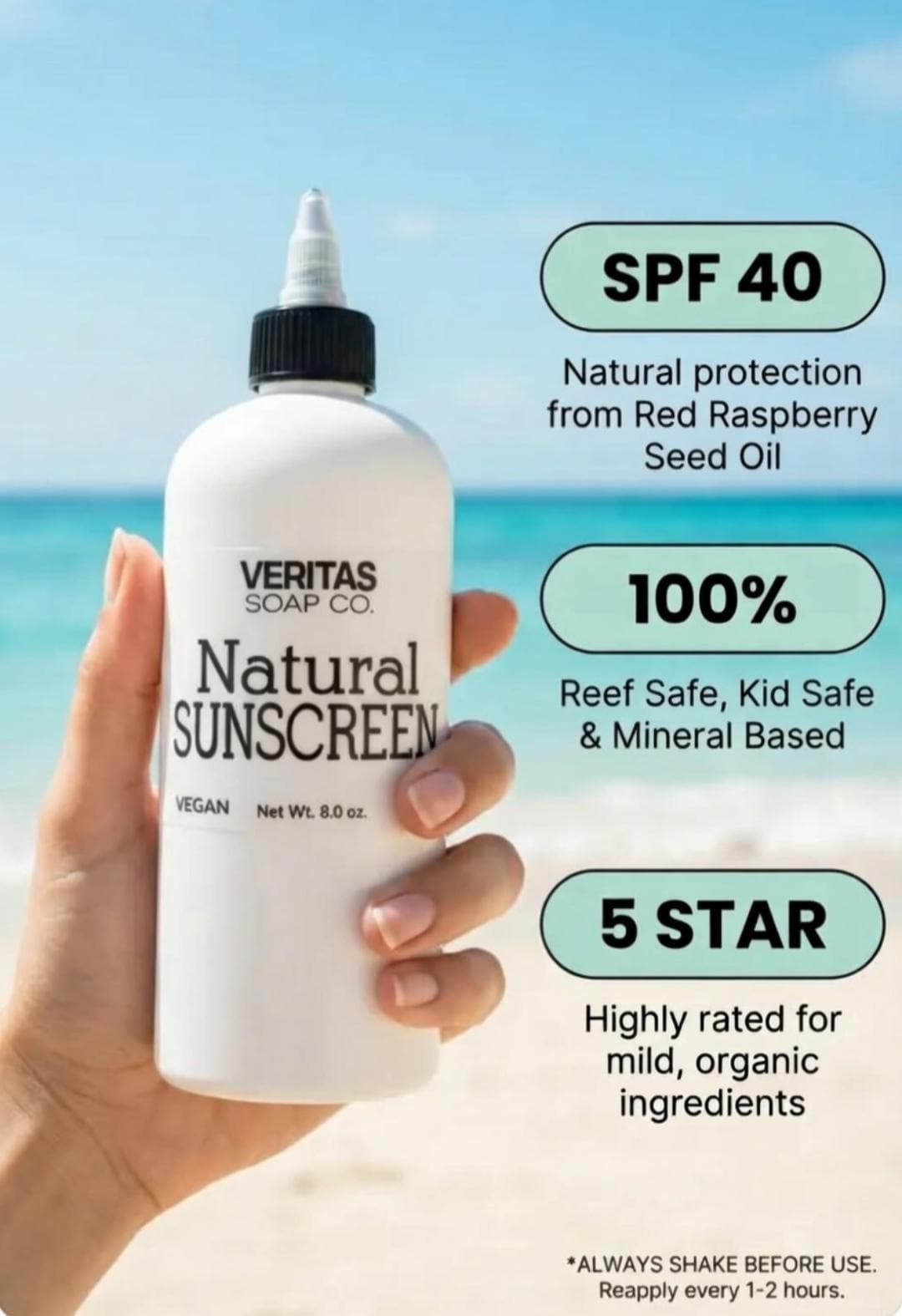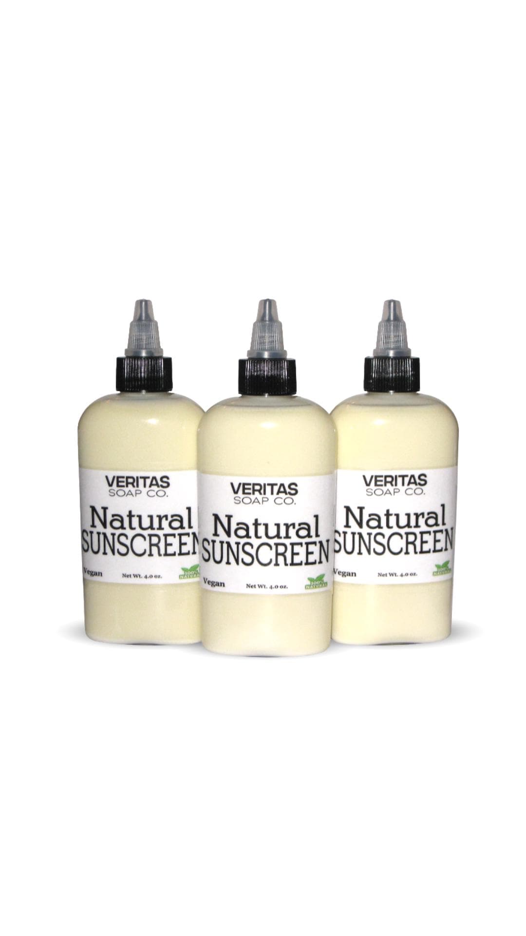 Veritas Soap Co.'s Sunscreen is formulated with beneficial ingredients such as Organic Coconut Oil (Natural SPF of about 10), Organic Olive Oil, Organic Jojoba Oil, Rice Bran Oil and Organic Red Raspberry Seed Oil (which has a natural SPF of about 40).