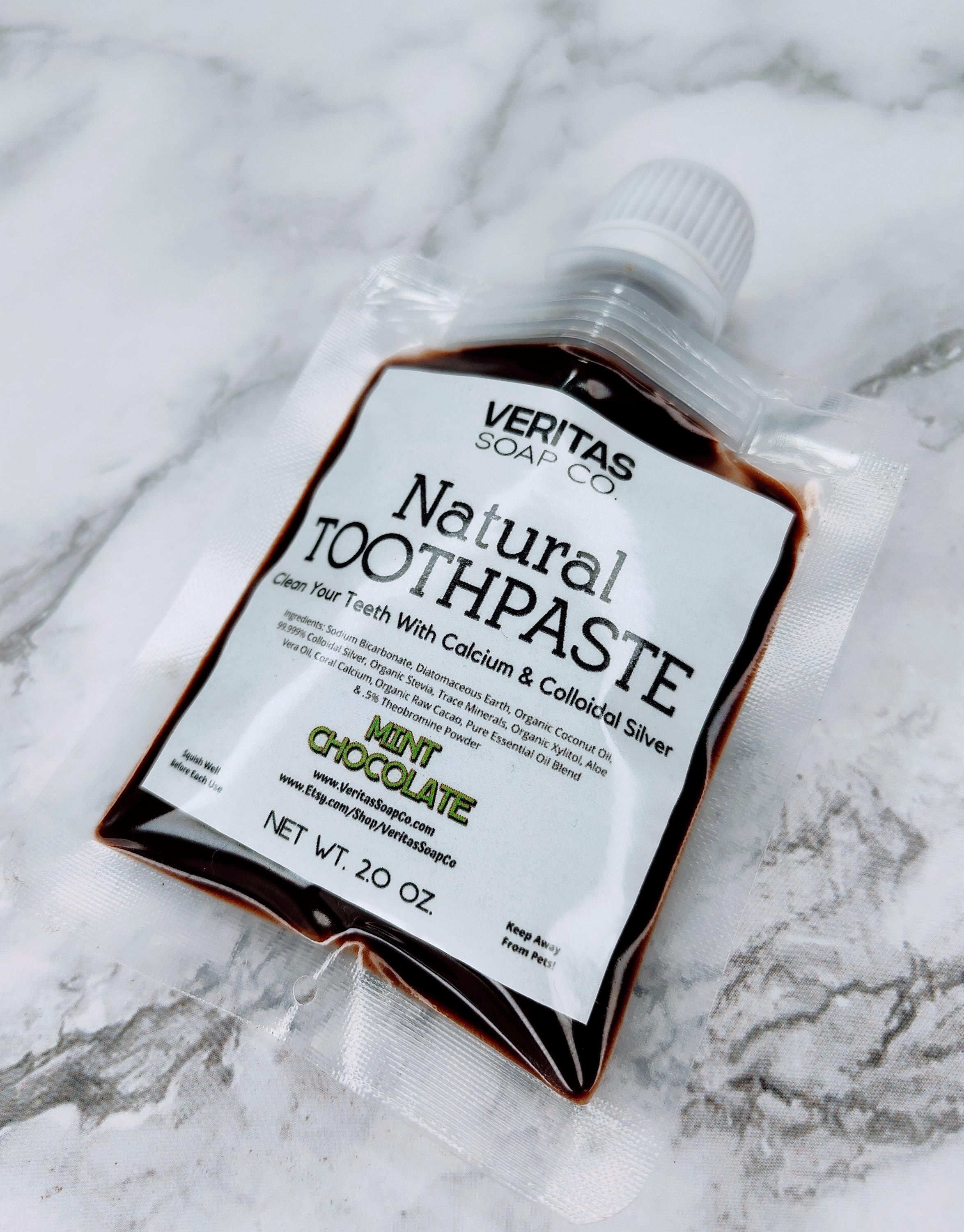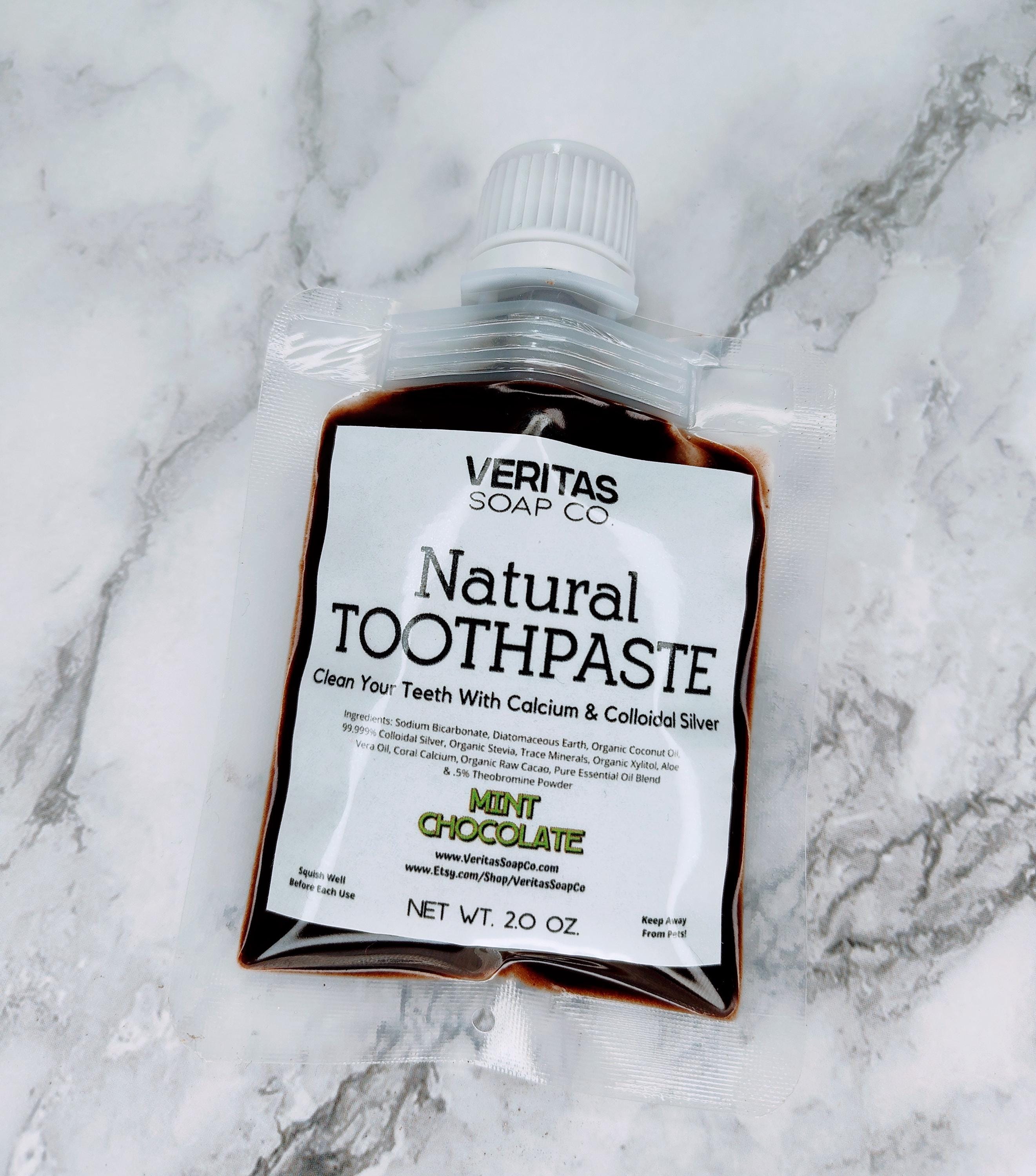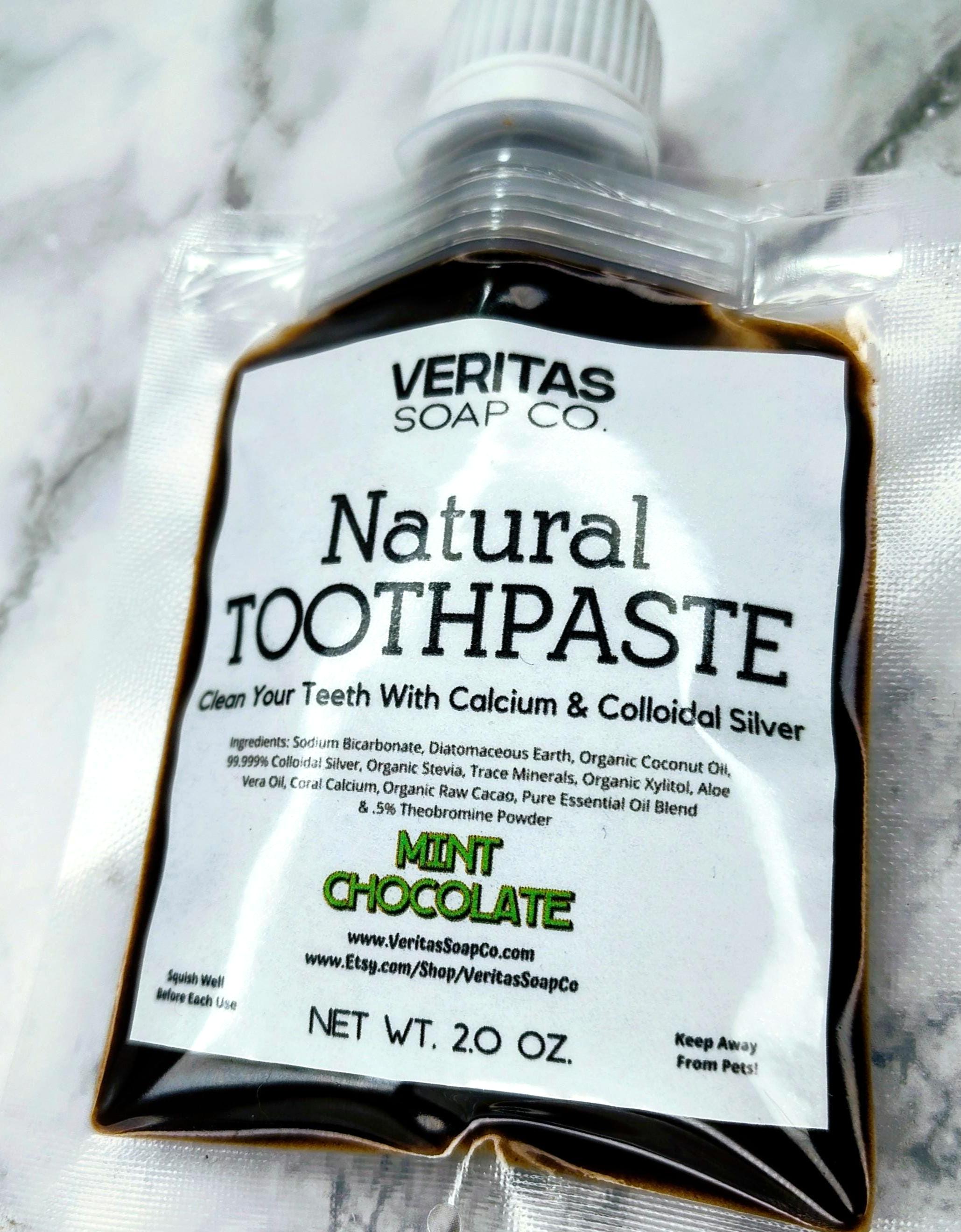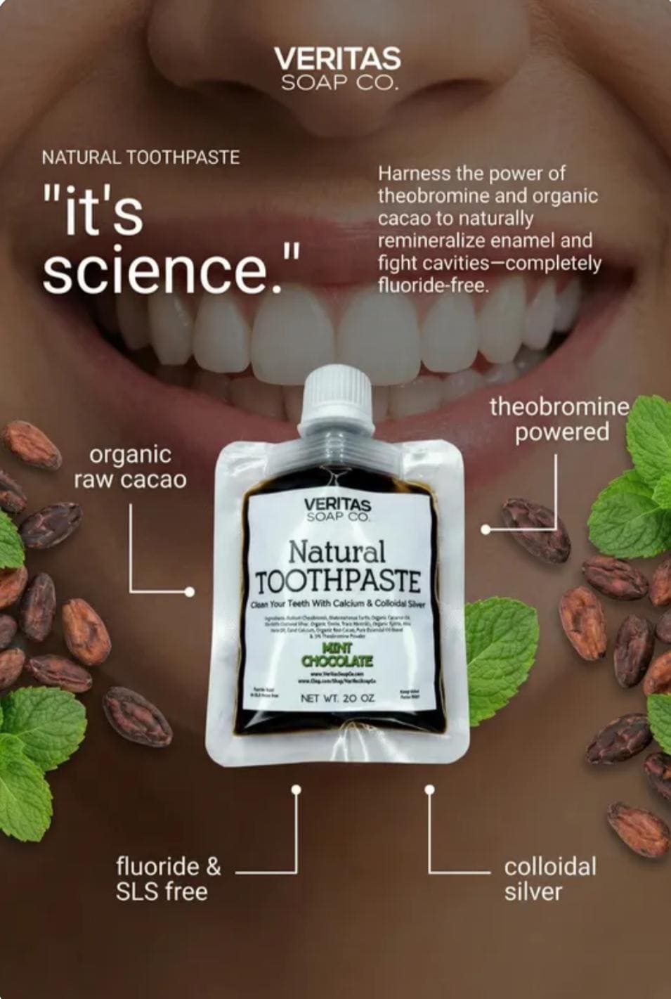 Veritas Soap Co.'s NEW Toothpaste is formulated with beneficial ingredients such as Organic Raw Cacao, Baking Soda, Food Grade Diatomaceous Earth, 99.999% Colloidal Silver, Organic Coconut Oil, 100% pure Essential Oils & Aloe Vera Oil.