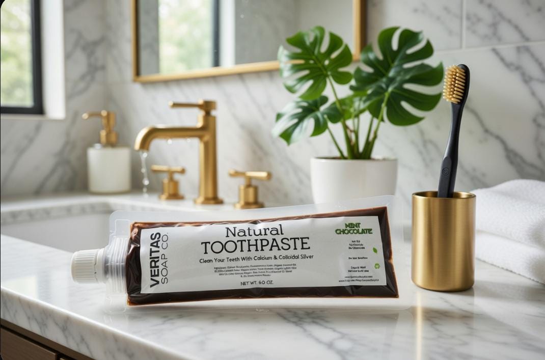 Veritas Soap Co.'s NEW Toothpaste is formulated with beneficial ingredients such as Organic Raw Cacao, Baking Soda, Food Grade Diatomaceous Earth, 99.999% Colloidal Silver, Organic Coconut Oil, 100% pure Essential Oils & Aloe Vera Oil.