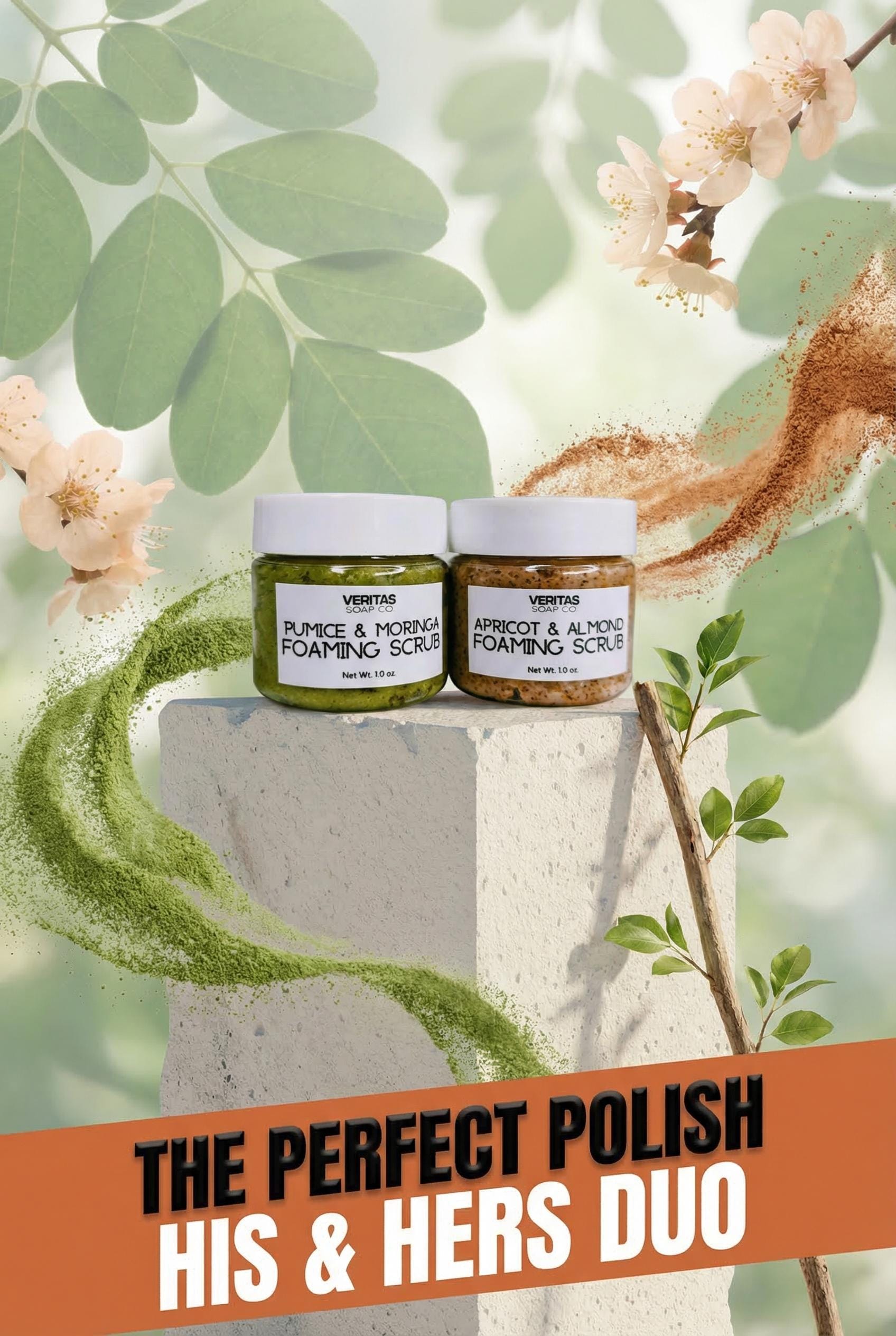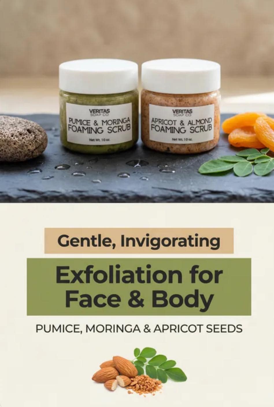 Sample PAIR of Pumice & Moringa Foaming Scrub AND Apricot & Almond Foaming Face Scrubs - Made with Organic Moringa Powder, Pumice Powder, Apricot Seeds, Almond Oil & pure Essential Oils such as Peppermint, Bitter Almond, Frankincense & Orange.