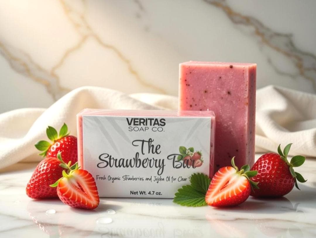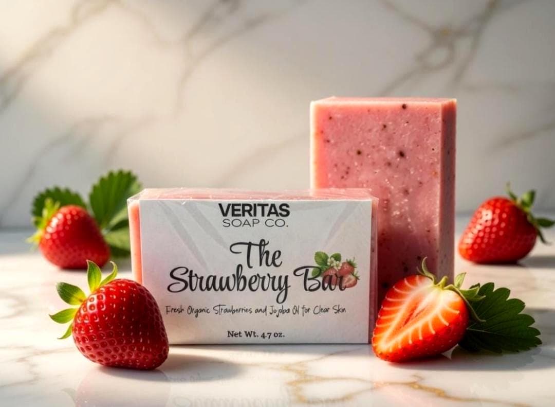 Indulge your skin in the sweet, sun-ripened goodness of The Strawberry Bar — a handcrafted soap made with fresh organic strawberries, ultra-nourishing Shea butter, and silky organic jojoba oil.