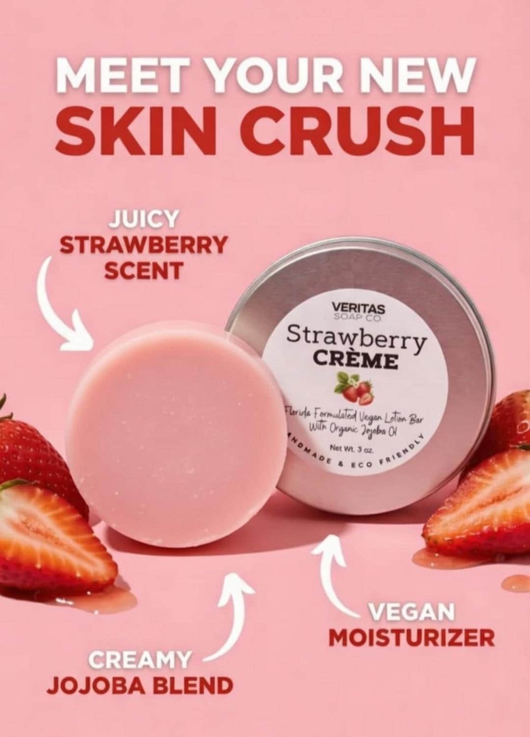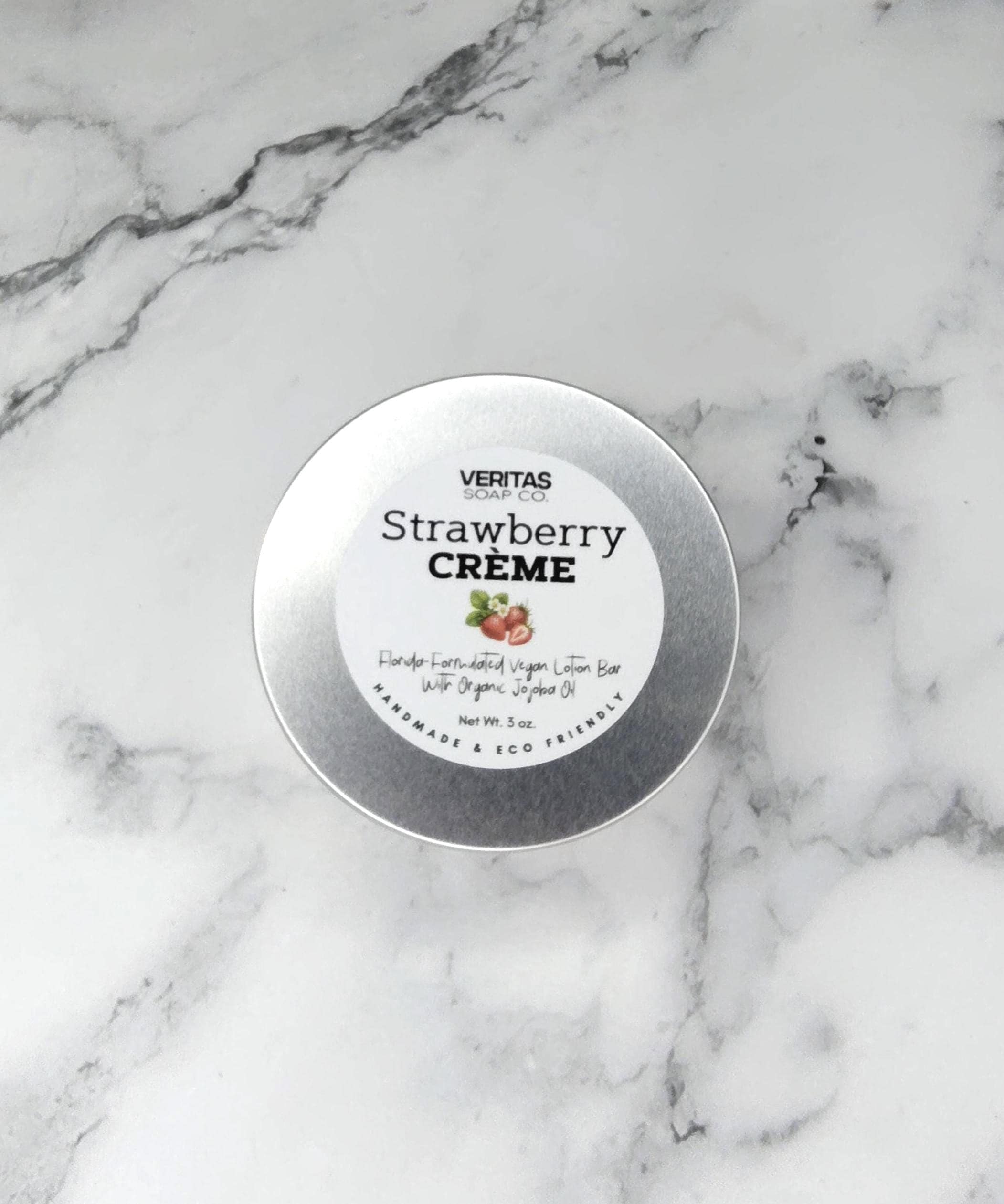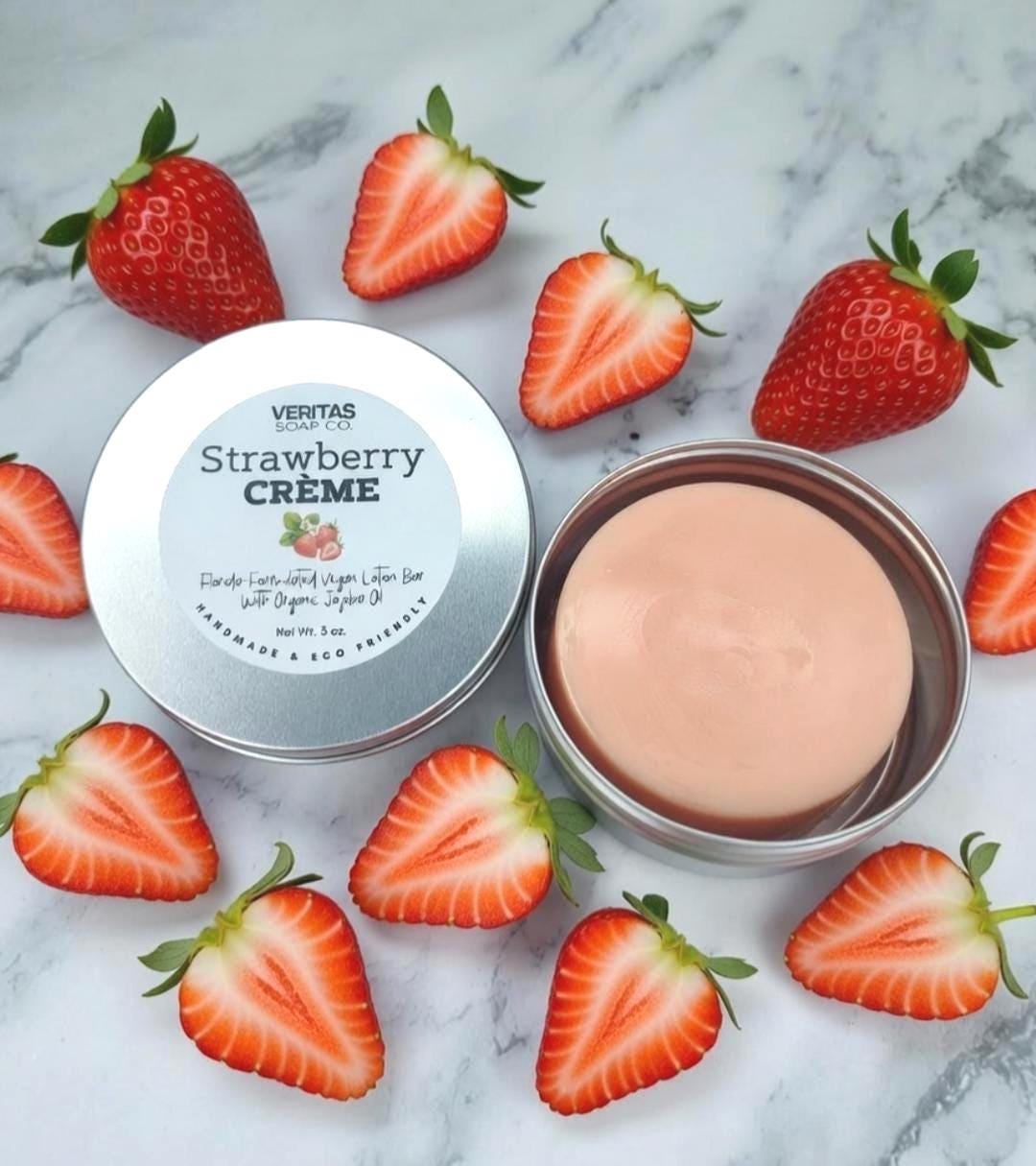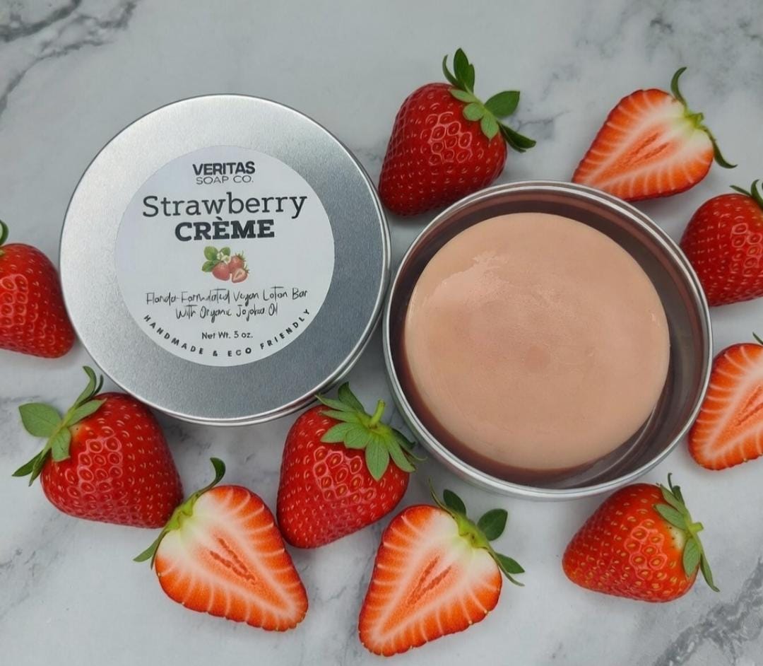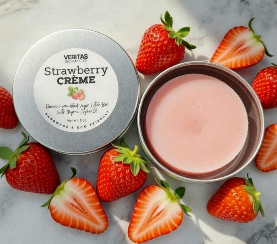 STRAWBERRY CRÈME Lotion Bar- Florida-Formulated Lotion Bar – 3oz – Vegan Moisturizer with Jojoba Oil in Metal Tin, Sweet Scent, Fruity