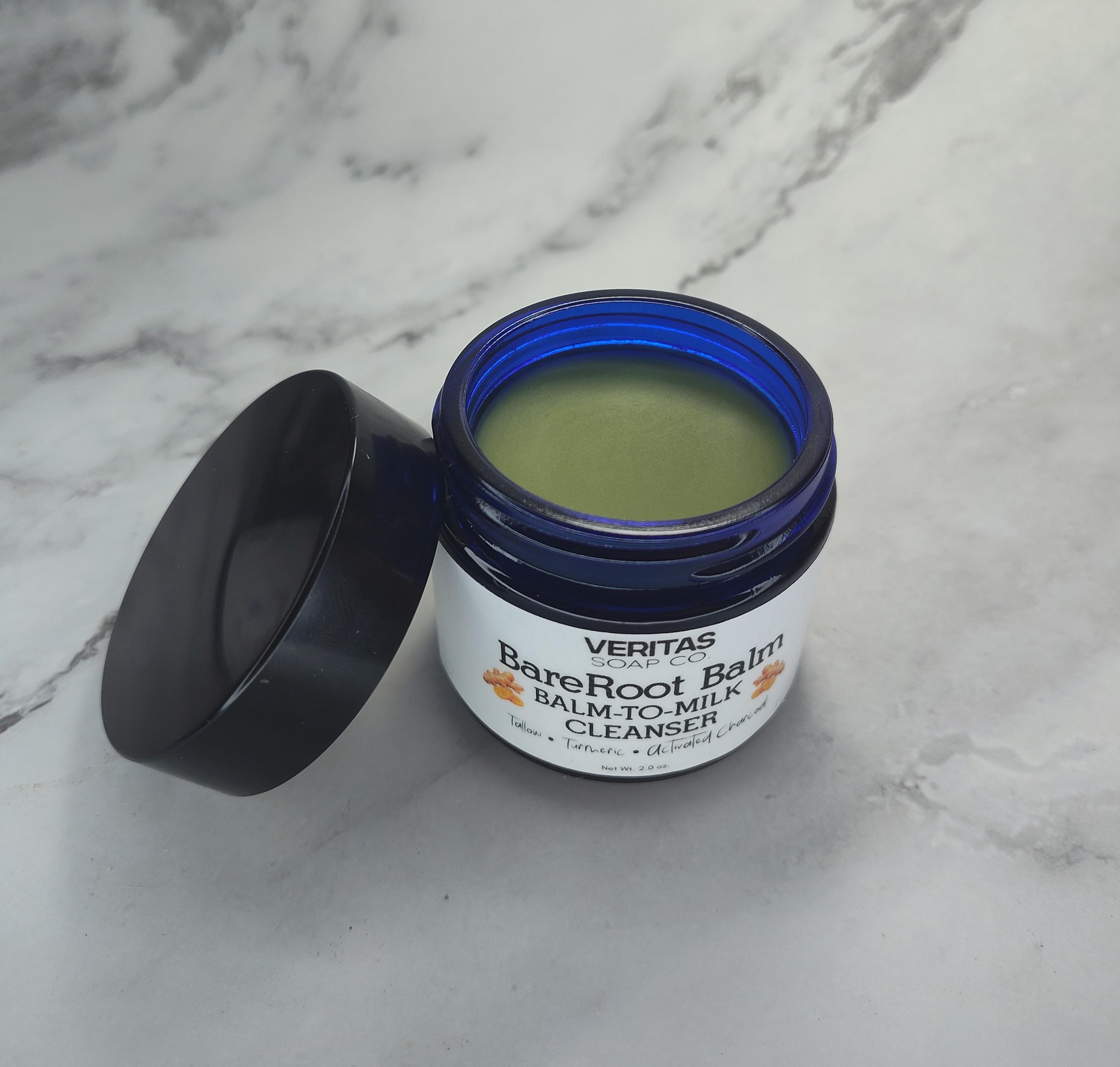 BareRoot BALM-to-MILK CLEANSER with Charcoal + Turmeric - A scoopable cleansing balm that melts into a creamy milk when rinsed with water. Formulated with tallow, olive oil, jojoba oil, castor oil, and skin-loving botanicals to gently cleanse while leaving skin soft and balanced.
