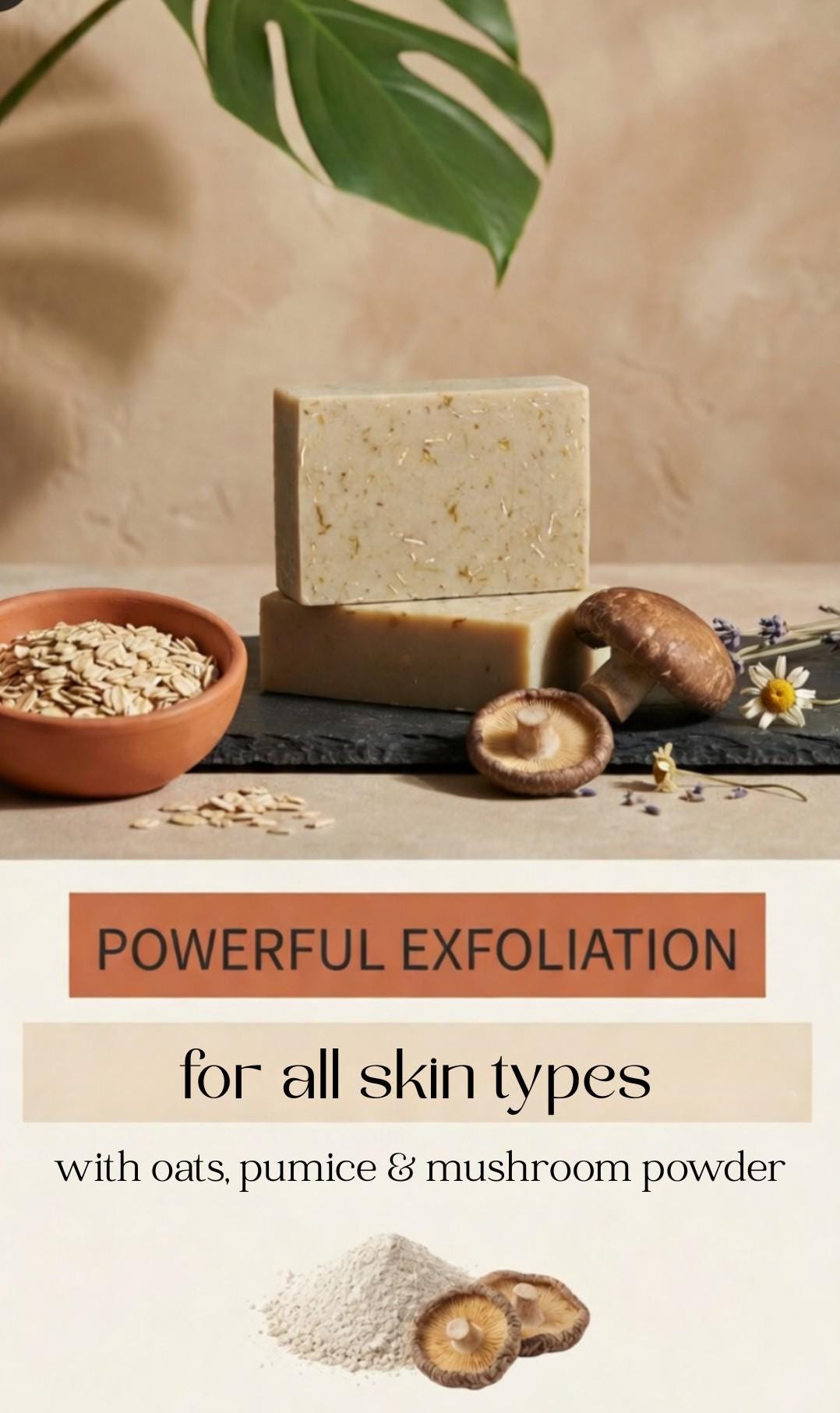Oatmeal and Mushroom Exfoliating Soap – The GROOVY BAR - Vegan Pumice Scrub Bar with Patchouli, Lavender & Lemon Essential Oils