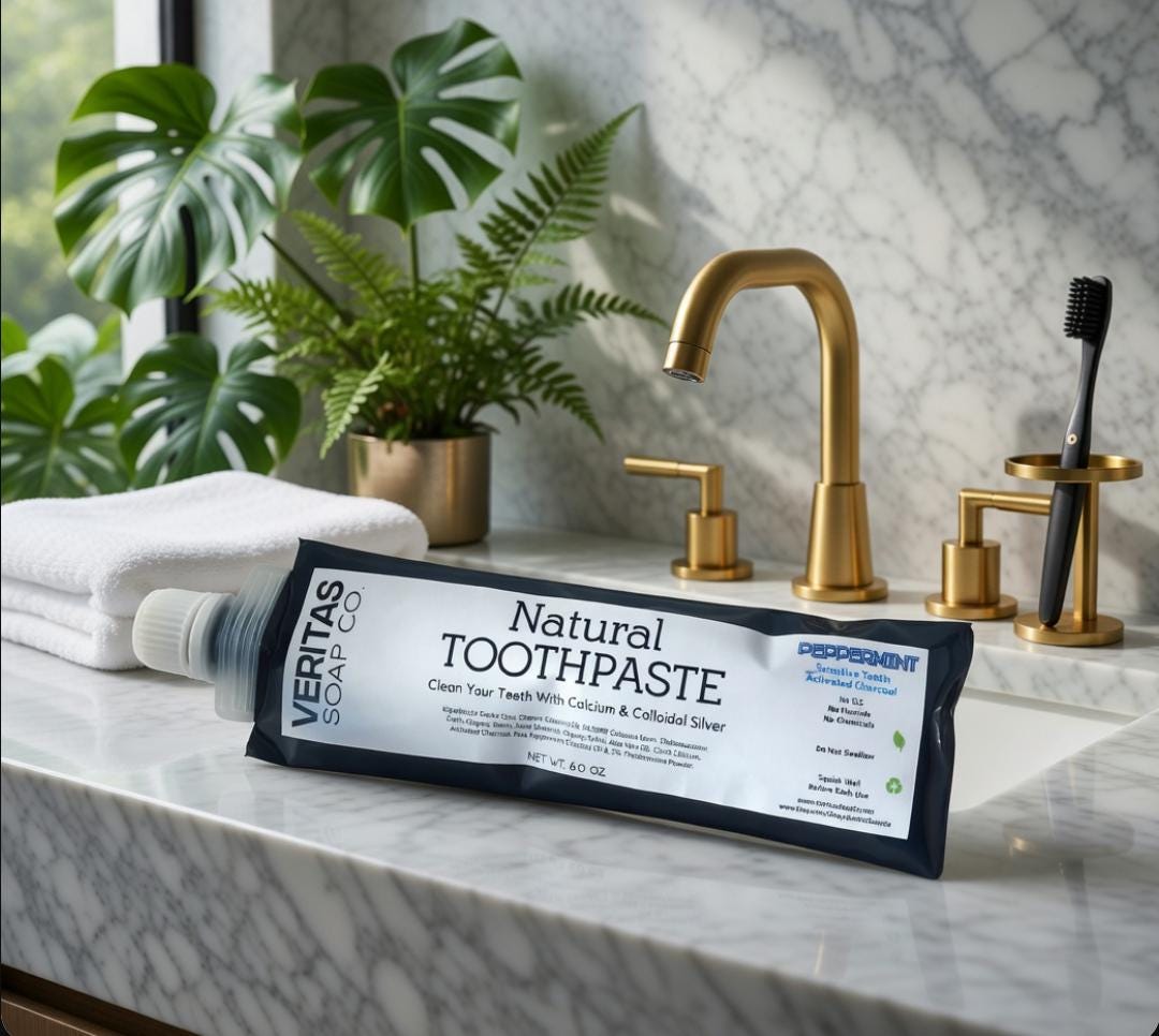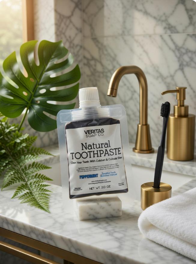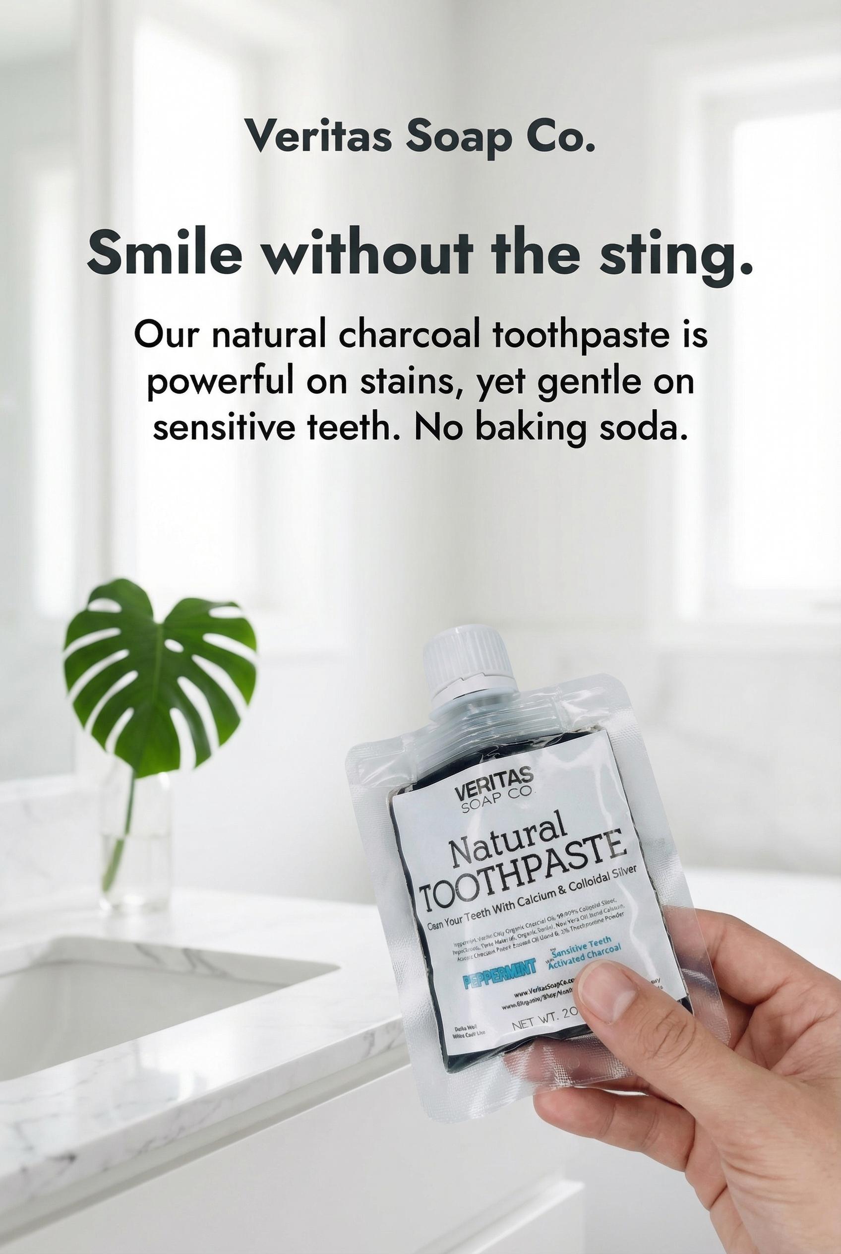 Check out our NEW Natural Toothpaste for SENSITIVE TEETH in PEPPERMINT now with ACTIVATED CHARCOAL!! Veritas Soap Co. Toothpaste is formulated with beneficial ingredients such as Kaolin Clay, Organic Food Grade Diatomaceous Earth, Calcium Carbonate, 99.999% Colloidal Silver, Organic Non GMO Coconut Oil, 100% pure Peppermint Essential Oil, Organic Aloe Vera Oil & Activated Charcoal. Same great formula but without the salty Baking Soda taste!! You can trust in our toothpaste for your whole family... Just check out our reviews!!!