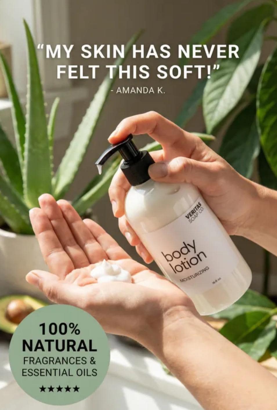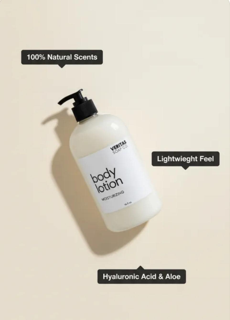 Veritas Soap Co.'s new Body Lotion is made with skin-loving ingredients like Hyaluronic Acid, Elderberry Extract, Resveratrol, Aloe Vera, Avocado Oil & Oat Extract.